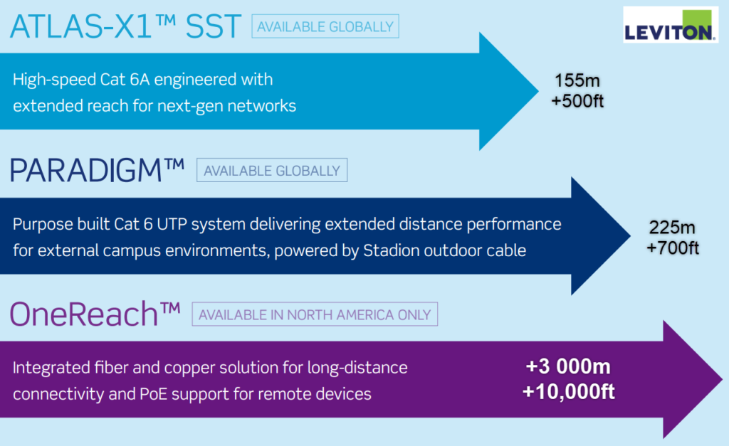 Today’s network needs require more than the standard 100m distance. Leviton’s 3 tiered extended distance system will get your network running, no matter the distance requirements.