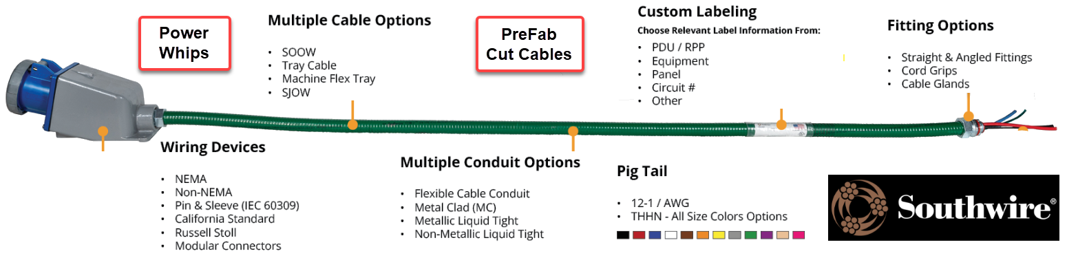 Southwire's Cables are manufactured with all UL Listed components as a complete UL Listed Wire Assembly. Every power whip is 100% factory tested through our proprietary automated testing process including HIPOT (Dielectric Withstand Voltage Test).